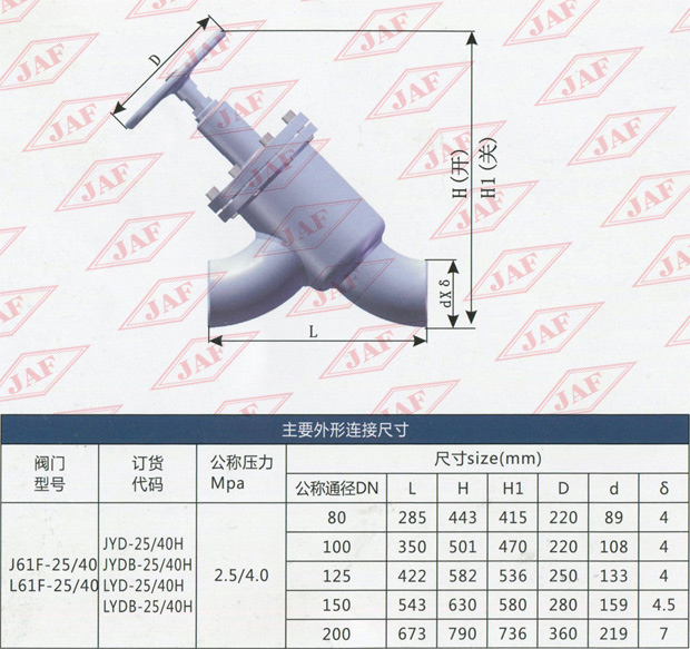 適用范圍 適用于公稱壓力為2.5/4.OMPa.公稱通徑為DN80 -DN200閥體材料為鋼質(zhì)焊接的對(duì)焊直流截止閥和節(jié)流閥?! ¢y門屬性 公稱壓力為2.5/4.0MPa,試驗(yàn)壓力為3.8/6.OMPa,適用溫度j -50°C-+200°C,適用介質(zhì)為氨、氟等?! 表示截止閥 Y表示結(jié)構(gòu)形式為直流式 D表示對(duì)焊連接 B代表巴士合金密封 25代表公稱壓力為2.5MPa H代表閥體材質(zhì)為鋼質(zhì)焊接。