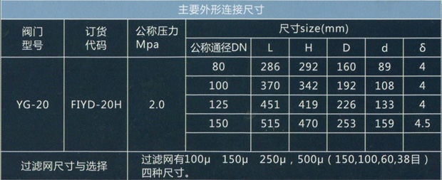 FI表示過(guò)濾器,Y表示結(jié)構(gòu)形式為直流式,D表示對(duì)焊連接,20代表公稱壓力為2.OMPa,H代表殼體材質(zhì)為鋼質(zhì)焊接。