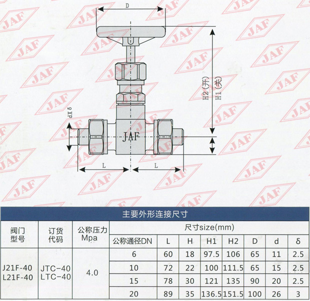 適用范圍  適用于公稱壓力為PN4.0MPa,公稱通徑為DN6、DN10、DN15和DN20,進(jìn)出口螺紋連接閥體材料為鋼質(zhì)的直通截止閥和節(jié)流閥?! ¢y門屬性  公稱壓力為PN4.0MPa,試驗(yàn)壓力為PN6.0MPa,適用溫度為-50°C-+200°C適用介質(zhì)為氨、氟等?! 表示截止閥 L表示節(jié)流閥 T表示結(jié)構(gòu)形式為直通式 G表示管接頭連接 40代表公稱壓力為4.0MPa,40后不標(biāo)注代表代表閥體材質(zhì)為鍛鋼。